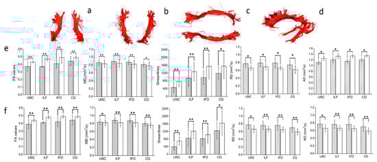 An illustrative reconstruction of the association of white matter (WM) tracts in a healthy control participant. (a) Uncinate fasciculi: UNC, (b) inferior longitudinal fasciculi: ILF, (c) inferior fronto-occipital fasciculi: IFO, (d) cingula: CG. (e,f) Diffusion tensor metrics for WM tracts for the (e) left hemisphere, and (f) right hemisphere. Filled bars represents MS results; white bars represents controls results. Bars are mean ± SD. * p < 0.05; ** p < 0.005; all unpaired two-tailed comparisons between MS and controls.