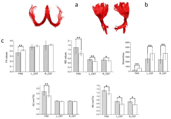 An illustrative reconstruction of the projection WM tracts in a control participant. (a) fornix: FNX, (b) corticospinal tracts: CST. (c) Diffusion tensor metrics. Patients’ results are shown as filled bars,; controls results are shown as white bars. L_CST: left corticospinal tract, R_CST: right corticospinal tract. Bars are mean ± SD. * p < 0.05; ** p < 0.005; all unpaired two-tailed comparisons between patients with MS and controls.