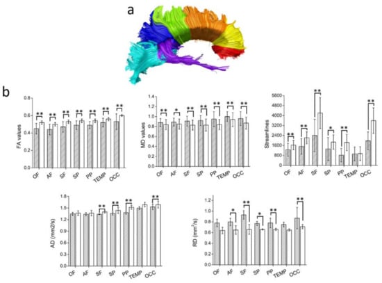 - Wakana, S.; Jiang, H.; Nagae-Poetscher, L.M.; van Zijl, P.C.M.; Mori, S. Fiber tract-based atlas of human white matter anatomy. Radiology 2004, 230, 77–87. [Google Scholar] [CrossRef]