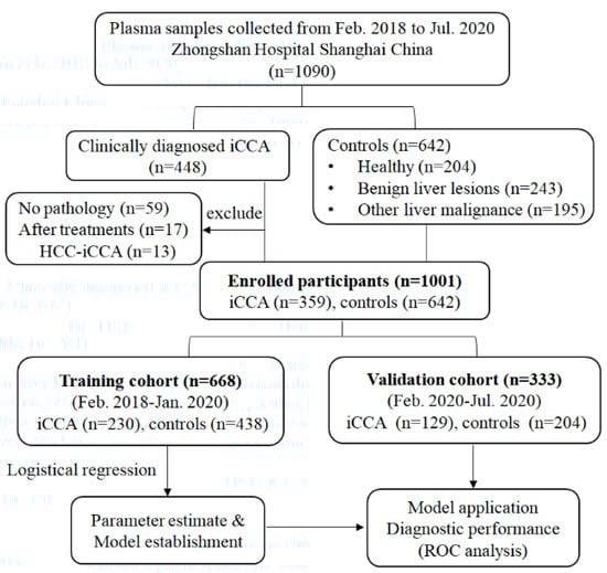 All the 1001 samples that met the eligibility criteria were allocated to two phases (2:1) in chronological order. The training cohort (n = 668) was selected to construct the diagnostic panel based on the logistic regression model for the differentiation between the iCCA patients and the control group. The validation cohort (n = 333) was adopted for independent validation of the model.