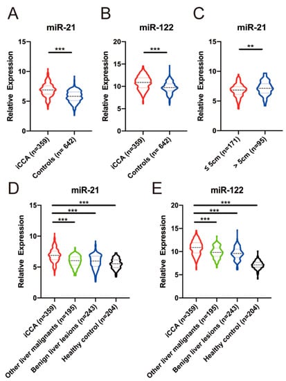 Relative expression of plasma miR-21 and miR-122 in iCCA and control patients. (A,B), The relative expression of plasma miR-21 and miR-122 in iCCA patients was significantly higher than that in control (p < 0.001). (C) The relative expression of plasma miR-21 in iCCA patients with > 5cm tumor size was significantly higher than iCCA patients with ≤ 5 cm tumor size (p = 0.009). (D,E), The relative expression of plasma miR-21 and miR-122 in iCCA patients was significantly higher than that in healthy, benign liver lesions, and other liver malignancies (all p < 0.001). **, p < 0.01; ***, p < 0.001.