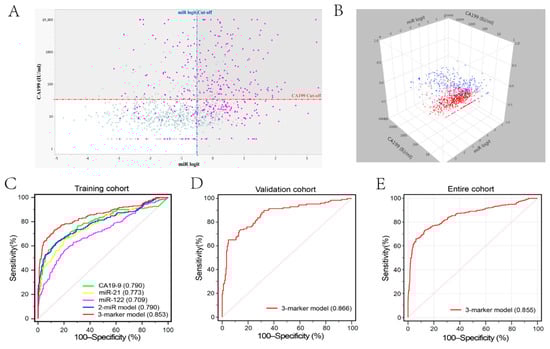 Diagnostic performance of CA19-9, miR-21, miR-122, 2-miR model and 3-marker model for iCCA. (A,B) The demonstration of CA19-9 level and 2-miR model in entire cohort by using two-dimension scatterplot and three-dimension scatterplot. iCCA patients (87.7%, 315/359) could be diagnosed by a combination of CA19-9 level and 2-miR model (gray shadow region). Red dotted line, cut-off value for CA19-9 (34 IU/mL); blue dotted line, cut-off value for 2-miR model (−0.494). (C) Diagnostic performance of five parameters for iCCA diagnosis in the training cohort. The AUC of three-marker model was significantly larger than CA19-9 (p = 0.009), miR-21 (p < 0.001), miR-122 (p < 0.001), and 2-miR model (p < 0.001). (D,E) Diagnostic performance of three-marker model in the validation cohort and entire cohort.