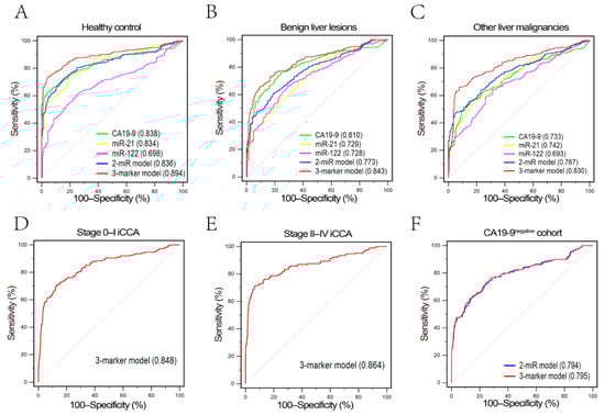 Subgroup ROC analysis for iCCA diagnosis. (A–C) Diagnostic performance of five parameters in healthy control subgroup, benign liver lesions subgroup and other liver malignancies subgroup. Three-marker model also demonstrated a preferable diagnostic efficacy than other parameters in three subgroups (Tables S3–S5). (D,E) Diagnostic efficacy of three-marker model for iCCA with different AJCC stage. Three-marker model still possessed a good diagnostic efficacy even in early stage iCCA. (F) Diagnostic efficacy of two-miR model and three-marker model for iCCA in CA19-9negative cohort.