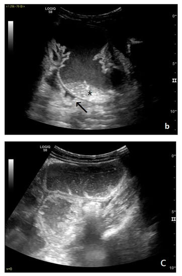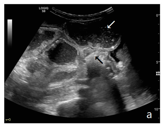 (a,b). A simple SBO. Ultrasound images show fluid-filled, dilated small bowel loops (a,b) with hyper-kinesis and hyper-representation of valvulae conniventes (white arrow) (a); tail comet artifacts are visible due to air-fluid levels (dashed arrow) (b) and groups of bowel loops with severe differences in diameter (‘bowel jump diameter’) are evident more superficially (*) (b). No free fluid was detected in the abdominal cavity or between bowel loops.