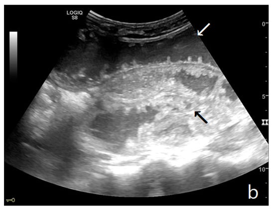 The ultrasound examination is performed with the patient in a supine position and spontaneously breathing, using a convex probe (2–6 MHz). A high-frequency linear probe (7–12 MHz) is used to better characterize the state of the loop and show the level of obstruction [34,35]. A complete ultrasound abdominal examination should be performed in order to confirm or exclude the presence of other pathologies (differential diagnosis); this is mandatory in order to avoid ‘satisfaction errors’, which, in the case of an ileus, are not scarce, considering that a mechanical ileus can have extraintestinal causes and paralytic ileus can represent a reaction to other underlying pathologies. The assessment of the intestinal loops is performed via the Global View technique [11,12]: a ‘global’ and panoramic assessment of the intestine is performed from the bottom upwards and with vertical probe movements exploring the entire abdomen starting from the right iliac fossa followed by horizontal movements from the right to the left side. The ‘global view’ approach allows for the identification of dilated small bowel loops; in the case of occlusion, it should not be underestimated that bowel loops can be dislocated and not grouped physiologically in the mesogastrium. Once the group of dilated bowel loops is identified, the diameter, kinesis, and parietal and valvulae conniventes thickness are evaluated (Table 1, Figure 1a,b and Figure 2).