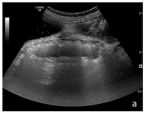 Parietal changes are characterized by the presence or absence of parietal and valvulae conniventes thickening and parietal wall stratification. The evaluation of parietal changes follows a dichotomic diagnostic process based on the reference values (normal thickness 1–3 mm, wall thickening >3 mm, thinned walls <1 mm): thickened walls/valvulae conniventes (YES/NO) or thinned walls (YES/NO) (Figure 3a,b) [29,30,35]. Although ultrasound allows us to identify the five concentric layers of the intestinal loops, this evaluation is not applied in the diagnosis of SBO. In practice, the evaluation is limited to the presence or absence of parietal stratification (two-layer double halo sign or three-layer target sign) (Figure 4a–d and Figure 5a,b) [29,35,42].