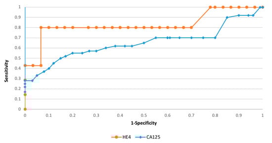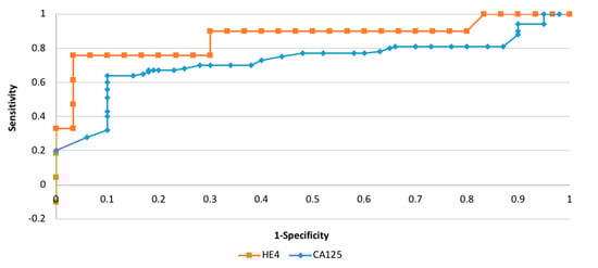 In order to evaluate the diagnostic values of HE4 and CA125, ROC curves were plotted, and the areas under the ROC curves (AUC) were calculated. Based on the ROC curves obtained in the study—Figure 1.