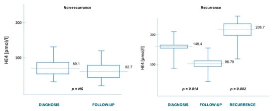 The exact distribution of the HE4 and CA125 marker’s median concentrations at the time of diagnosis, follow-up, and disease recurrence is presented in Table 5 and Table 6.