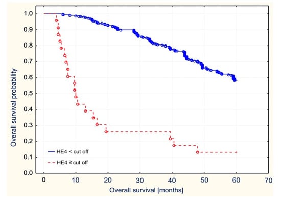 Overall survival stratified by the cut off HE4 value in the examined patients with endometrial cancer.