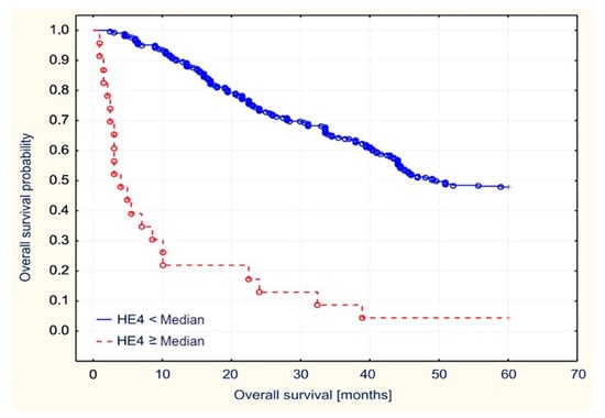 We have performed a statistical analysis using the Kaplan–Meier survival curves and log-rank tests. They revealed a statistically significant inverse correlation between the median levels of HE4 and the time of disease-free survival (p = 0.02). Patients presenting with values above the median were characterized by disease-free survival time that was shorter by 9.9 months.