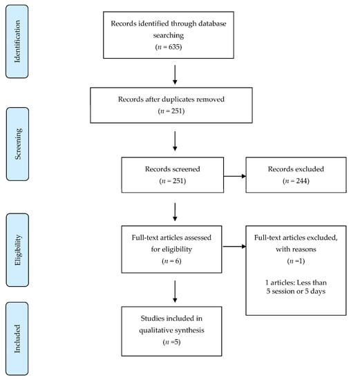 We identified 251 records through the searches after removal of duplicates. No additional records from other sources were identified. After screening the titles and abstracts, we excluded 244 records mainly because the studies were animal studies, abstracts only, articles reporting on protocols, in-progress trials, retrospective studies or case reports, systematic review, non-English language publications and completely irrelevant articles. Among those remaining (n = 6), three studies used repetitive transcranial magnetic stimulation (rTMS) and three studies used transcranial direct current stimulation (tDCS) [25,26,27,28,29,30]; however, one study [25] had less than 5 sessions or 5 days of NIBS and was excluded, leaving five studies for review [26,27,28,29,30].