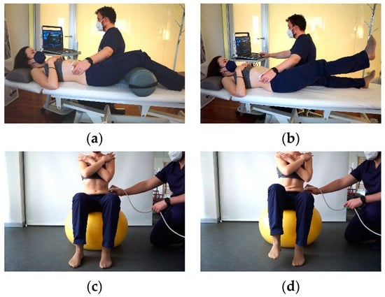 Images representing the positions used to measure TA muscle thickness at rest and contraction in different positions to obtain the CR (a) Transversus abdominis (TA) thickness measurement in supine lying (static at rest) with 60-degree hip flexion, (b) TA thickness measurement in supine lying during holding the lower extremity in the raised position, (c) TA thickness measurement in at rest on Fitball, (d) TA thickness measurement in contraction on Fitball with contralateral foot elevation.
