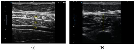 All sonographic images were processed offline using software (Image J; US National Institutes of Health, Bethesda, MD, USA). The cursor points carefully measured the TA and LM muscle thickness. The transducer was not moved during the testing procedure. Linear measurements between the superficial and deep hyperechoic fasciae perpendicular to the muscle fibers in millimeter (mm) were taken as the TA muscle thickness. The thickness of the LM was taken as the linear distance between the most posterior portion of the target facet joint and the thoracolumbar fascia. To ensure standardized placement of the measurement line, a straight vertical line through the center of the sonographic image was used. Contraction thickness ratio of TA and LM muscles were calculated as (CONTRACTION)-(REST)/REST [29,30] (Figure 3).