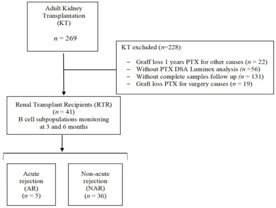 Figure 1). Only those whose kidney transplant was in operation for at least one month after transplantation (PTX) and who had all DSA Luminex determinations for detecting anti-HLA antibodies and all follow-up samples were enrolled. Allograft loss was estimated as a return to dialysis. Thus, the specific B-cell monitoring study was finally performed on 41 renal transplant recipients (RTRs), whose specific clinical and demographic characteristics are shown in