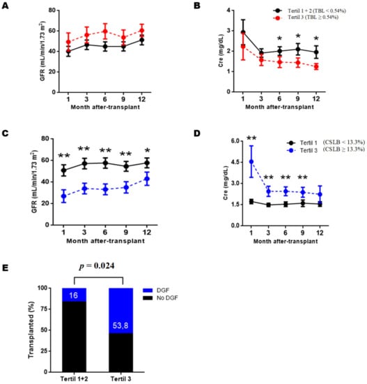 BL subpopulations with graft function, we divided the RTRs into three groups based on the tertiles obtained for each subpopulation. In this way, the RTRs assigned to tertile 1 would be those with the lowest values for a given subpopulation, those assigned to tertile 2 would be in the middle range, and those assigned to the tertile 3 would be in the higher levels. We then compared the estimated glomerular filtration rate and serum creatinine obtained during the first year of PTX between tertiles. The results show that after three months of PTX, BL transitional (BLT) and Class-Switched BL (CSBL) were correlated with serum creatinine levels and graft function (