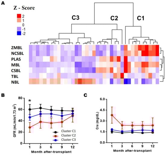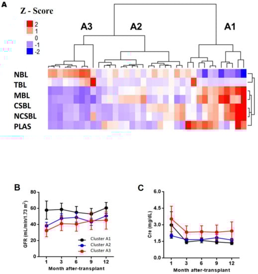 Figure 5A shows that three large clusters are obtained six months PTX (clusters C1, C2, andC3). Clusters C1 was characterized by having the highest memory/naïve ratio, with equal BL memory levels (36.6 ± 10.1%) and LB naive (48.9 ± 13.0%). It had mean values of LBT (0.56 ± 0.72%) and plasmablasts (1.93 ± 2.70%). Cluster C2 was characterized by a lower ratio of memory/naive than cluster C1, with LB naive levels of 57.4 ± 9.36% and LB memory of 23.3 ± 4.87%. It had high levels of LBT (2.76 ± 1.46%) and plasmablasts (1.56 ± 2.47%) and was the cluster with the highest levels of CSBL (16.1 ± 5.06%). Cluster C3 had the lowest memory/naive ratio, with 72.0 ± 8.13% naive BL and low levels of LBT and plasmablasts. When comparing the incidence of AR and graft function, differences between clusters C1 and C2 were only observed in glomerular filtration rate estimated after one month of PTX (