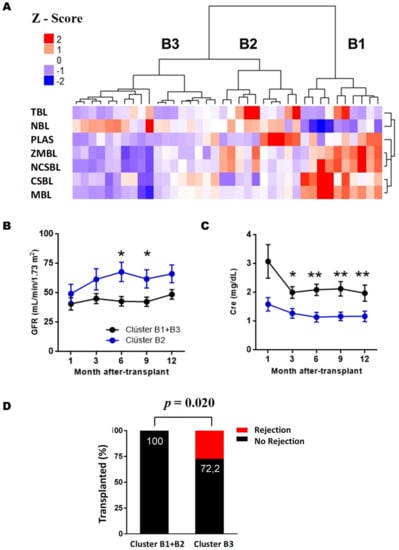 26]. Our data reveal that RTRs can be classified into three clusters after three months of PTX, based on BL and the phenotypic profile of BL, and that these are correlated with the clinical evolution of PTX. TKRs with good PTX evolution, good renal function, and AR absence are characterized by a higher frequency of transitional BL and plasmablasts than those grafts with poorer evolution. Zarkhin et al. [
