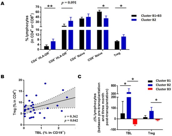 p = 0.018). Regarding Tregs, the difference between pre-and post-transplantation was also significant when comparing clusters B1 and B2 (