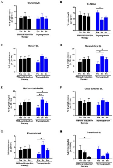 In the RTR group without induction therapy, no significant differences were observed in any BL subpopulation except for transitional BLs (