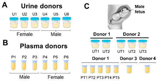 Normal donor specimens used in study. (A) Six normal urine donors (U1–6). (B) Six normal plasma donors (P1–6). Urine and plasma donors are non-matched. (C) Urine and plasma specimens collected from four third-trimester pregnant (PG) donors carrying a male fetus. Donors 1 (UT1, UT2) and 2 (UT1–3) urine was collected at five different timepoints. Donor 1 PG plasma was collected in-house at PT1–PT5 timepoints. Donors 3 and 4 PG plasma was collected by Lee BioSolutions. All urine samples were collected in-house.