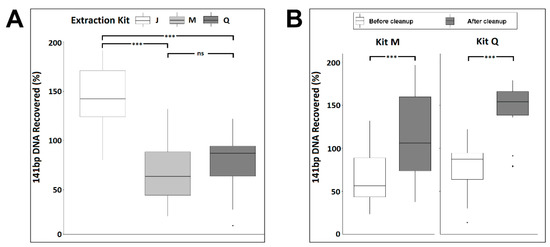 Synthetic 141 bp spike-in DNA recovery from normal urine donors by three cfDNA extraction kits as measured by qPCR before (A) and after (B) DNApure cleanup. For each kit, triplicate extractions were performed for each of the six urine donors. “Cleanup” indicates samples were further purified using DNApure cleanup. Significance levels of differences between samples under brackets as assessed with Tukey’s post hoc test are indicated (ns, p > 0.1; ***, p < 0.001).
