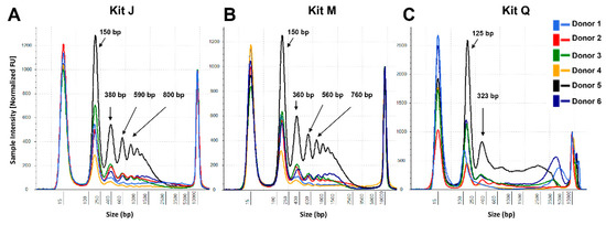 Given the importance of obtaining nucleosomal-sized DNA from liquid biopsies, we first compared the overall fragment size distributions of cfDNA isolated from six normal urine donors with the three kits. Because it is known that sex impacts urinary DNA yield [12], three male and three female donors were included (Figure 1A). Representative electropherograms of cfDNA isolates obtained with each kit are compiled for each donor in Figure 2. Interestingly, in some donors the DNA size profiles were different among the kits. For example, donors 1 and 6 showed detectable mono- and di-nucleosomal-sized peaks in kit J and M, but not in kit Q isolates. Overall, all three kits were able to isolate mono-nucleosomal-sized DNA, except in male donor 5, whose samples produced low DNA yields with all three kits.
