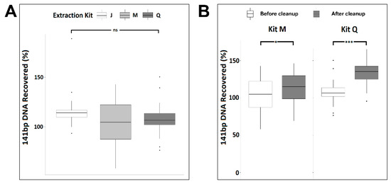 Impurities, salt, or the amount of large genomic DNA in the isolated cfDNA could impact the size distribution and peak heights in the electropherogram analysis. As mono-nucleosomal-sized DNA is the predominant species of cfDNA, we evaluated the efficiency of the three kits in recovering mono-nucleosomal-sized DNA. We utilized a 141 bp double-stranded PCR product spike-in as a mimic of mono-nucleosomal-sized cfDNA to assess recovery efficiency. The PCR product was added into each urine sample at 106 copies/mL. As assessed by qPCR, the spike-in DNA was recovered at concentrations ranging from 7.8 × 104 to 3.7 × 106 copies/mL among the six donors. However, on average, kit J recovered significantly more spike-in DNA than did kits M or Q (ANOVA, p < 0.001) (Supplementary Materials Table S1, Figure 3A). The apparent spike-in recovery efficiency, exceeding 100% in some samples, may indicate further spike-in PCR product purification during the extraction process, improving the downstream PCR amplification efficiency.