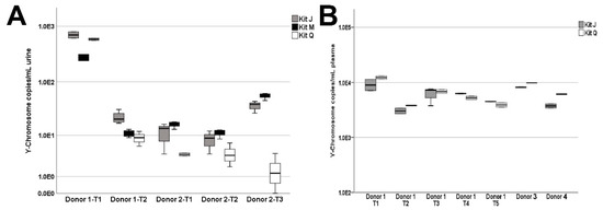 Y-chromosome DNA extracted from liquid biopsy specimens of pregnant donors carrying a male fetus. (A) Y-chromosome quantities isolated from urine collected from two donors over five time points (Donor 1: T1 and T2; Donor 2: T1, T2, and T3). (B) Y-chromosome quantities isolated from 0.5 mL plasma. Donor 1 had matched plasma sampled at times T1 and T2 and subsequently plasma only at times T3, T4, and T5. Due to limited PG plasma quantities, cfDNA was extracted with kits J and Q only.