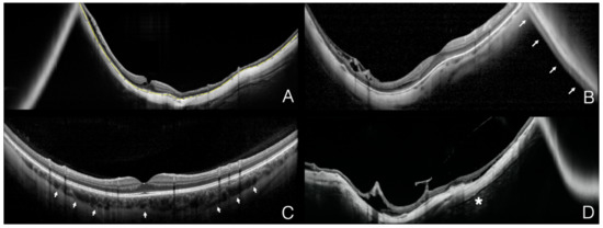 - Cereda, M.G.; Corvi, F.; Cozzi, M.; Pellegrini, M.; Staurenghi, G. Optical coherence tomography 2: Diagnostic tool to study periph-eral vitreoretinal pathologies. Retina 2019, 39, 415–421. [Google Scholar] [CrossRef] [PubMed]