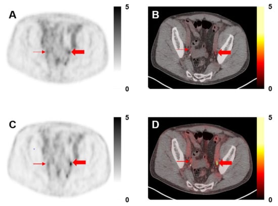 A 68-year-old man with history of prostatectomy and adjuvant chemohormonal therapy, now with an increase in prostate-specific antigen (PSA) to 0.3. (A) 18F-DCFPyL positron emission tomography (PET) and (B) PET/computed tomography (CT) axial images without point-spread function (PSF) demonstrating bilateral PSMA-RADS-3A pelvic lymph nodes (thin and thick red arrows, maximum standardized uptake value (SUVmax) 1.2 on the right and 1.5 on the left). (C) 18F-DCFPyL PET and (D) PET/CT axial images with PSF show that the right pelvic PSMA-RADS-3A lymph node does not appear significantly more conspicuous (SUVmax 2.2) and that lesion was not re-categorized. However, the lymph node on the left (SUVmax 2.5) was thought to be more conspicuous and was re-categorized to PSMA-RADS-4.