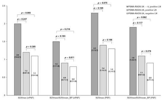 Bar graph representation of medians and interquartile ranges for the SUVmax-lesion and SUVmax-lesion/SUVmean-blood-pool metrics of the PSMA-RADS-3A lesions included in this study. In each bar of the graph, the top number is the median and the interquartile ranges are listed below. Note the trends towards higher SUVs of the lesions that were re-categorized as PSMA-RADS-4 (dark grey), although none of these relationships reached statistical significance (i.e., all p > 0.05). SUV = standardized uptake value; nPSF = non-point-spread function; BP = blood-pool; PSF = point-spread function; LN = lymph node.