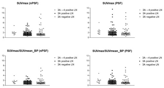 For the 13 PSMA-RADS-3A lesions that were re-categorized to PSMA-RADS-4, the SUVmax-lesion and SUVmax-lesion/SUVmean-blood-pool on both non-PSF and PSF images were generally higher than those lesions that were not re-categorized (Figure 2), although these differences were not statistically significant (p = 0.085–0.216). Similar to our prior findings [], there was no difference in the SUVmax-lesion and SUVmax-lesion/SUVmean-blood-pool values between those lesions that were true positive and those that were not confirmed to be true positive (Figure 2, p = 0.198–0.811). The distributions of uptake in the different lesion categories overlapped on both non-PSF and PSF reconstructed images (Figure 3).