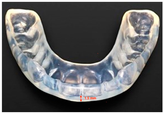 The present observational protocol was approved by the Ethics Committee of the University of L’Aquila, Italy (Document DR206/2013, dated 10 January 2014). Data from a sample of 40 subjects, 20 males and 20 females, aged between 20 and 30 years old (average 25 years), who were going to receive an occlusal appliance for the management of TMD at George Eastman Dental Hospital in Rome (Italy) were selected for the present study. All the patients complained of muscle tension headache, associated with masticatory muscle pain to palpation, as well as pain during mandibular movements. None of them was affected by disc displacement, or degenerative joint disease. All patients were treated with an individualized 1.5 mm thick occlusal appliance, made of a heat-cured acrylic resin (Duran®, Scheu-Dental Technology, Iserlohn, Germany), applied in their lower jaw (Figure 1).