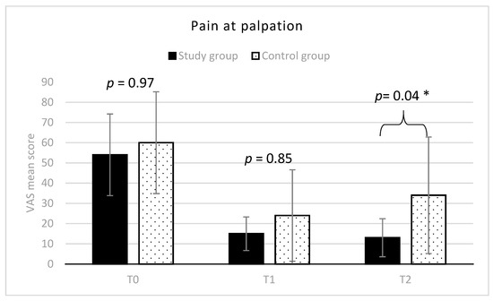 Muscle pain at palpation (mean VAS scores and SD) in the two groups. * indicates between groups statistically significant differences (p < 0.05).