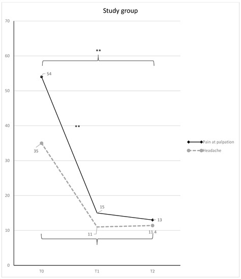 Muscle pain at palpation and headache (mean VAS scores and SD) in the study group, with statistically significant differences overtime (* = p < 0.05; ** = p < 0.01).