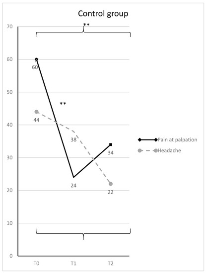 Muscle pain at palpation and headache (mean VAS scores and SD) in the control group, with statistically significant differences overtime (* = p < 0.05; ** = p < 0.01).