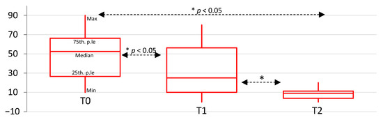 The control group showed a statistically significant decrease of VAS score from T0 to T1 (Wilcoxon ranks z = −3.40; p < 0.01); from T0 to T2 (Wilcoxon ranks z = −3.74; p < 0.01); and from T1 to T2 (Wilcoxon ranks z = −3.04; p < 0.01) (Figure 6).