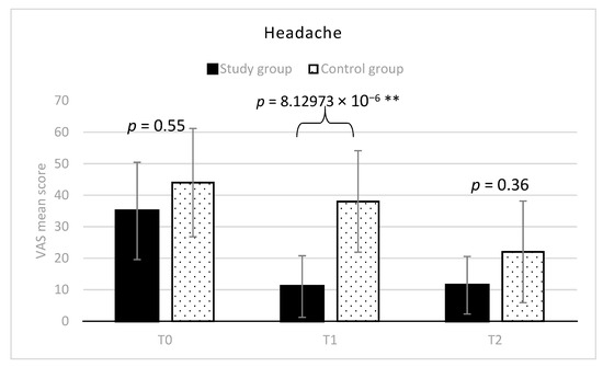 Headache at palpation (mean VAS scores and SD) in the two groups. ** indicates between groups statistically significant differences (p < 0.01).