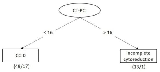 Figure 1 shows the best tree structure generated by J48 and REPTree for classifying and predicting incomplete cytoreduction, with a sensitivity of 0.414, a specificity of 0.939, an F-measure of 0.558, and an area under an ROC curve of 0.635 (Table 3). With a CT-PCI > 16, 92.3% (12/13) of the patients could not achieve CC-0.