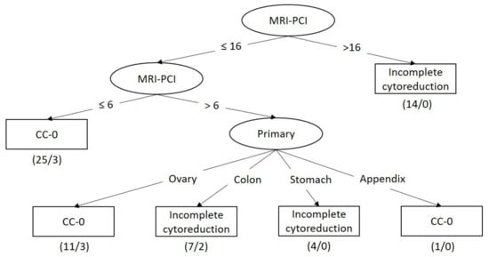 J48 and REPTree algorithms were used for classifying and predicting the surgical outcome (CC-0 or non-CC-0) for patients who underwent CRS/HIPEC. The evaluation metrics for predicting incomplete cytoreduction are shown in Table 3. For the CT dataset, J48 and REPTree produced the same model with identical performance (accuracy = 69.4%, ROC area = 0.635). For the MRI dataset, the REPTree algorithm produced a simpler and more accurate model compared with J48 (accuracy = 79.0% and size of the tree = 9 for REPTree vs. accuracy = 72.6% and size of the tree = 11 for J48). For the surgery model, J48 performed better than REPTree in terms of accuracy of classification, but for the complexity of tree structure, REPTree was better because it generated a simple tree structure (size of tree = 3) while J48 generated a tree with a tree size of 11. The best surgery model generated by REPTree consisted of one root node and two leaf nodes with a branch (PCI ≤ 20 or PCI > 20).
