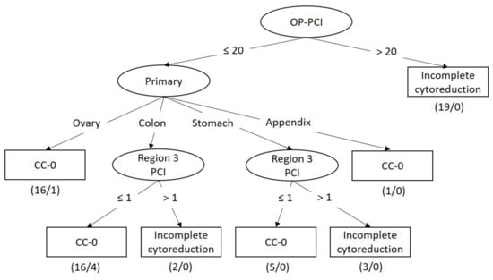 Diagnostic or exploratory laparotomy is considered as the best method to assess the PCI and resectability. As expected, the surgery model was considered the best among the three models. The best tree structure for the surgery dataset was generated by J48 (Figure 3), with a sensitivity of 0.793, a specificity of 0.939, an F-measure of 0.852, and an area under the ROC curve of 0.868 (Table 3). With an OP-PCI > 20, none of the patients could achieve CC-0 status.