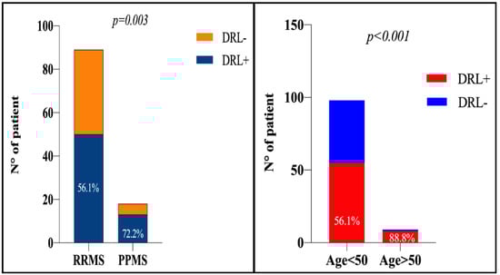 A total number of 1260 white matter (WM) lesions were reviewed in 107 MS patients. Of these, 216 DRLs (17.2%) were identified in the 1.5-tesla WM-DIR sequence. Overall, 63/107 patients (58.9%) had at least 1 DRL. The occurrence of DRLs was 1.3-fold higher in PPMS patients (13/18, (72.2%)) than in RRMS patients (50/89 (56.1%); p = 0.003) with a significant difference in terms of DRL number between PP- (median 5.5, range 0–10) and RRMS patients (median 1, range 1–8; p = 0.002) (Figure 2). DRLs were also more frequent (8/9 (88.8%)) in older patients (age > 50) than younger (55/98 (56.1%); p < 0.001) (Figure 3) and their number were correlated with disease duration (rho0.41, CI 95% 0.24–0.55; p < 0.001).