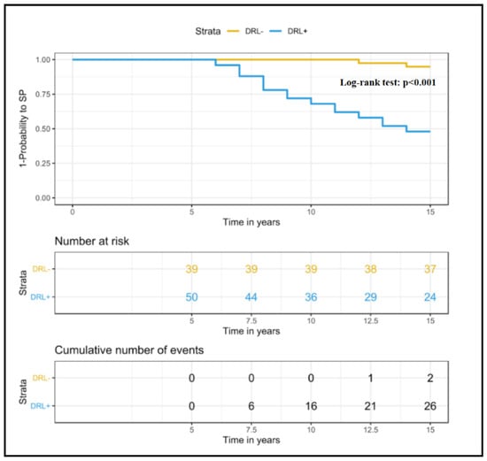 The survival analysis of predictive factors of developing SPMS showed a contribution of DRLs (HR 2.68, CI = 1.13–22.3; p = 0.001) in addition to age at disease onset, baseline EDSS and GM damage load (Table 4). Kaplan–Meier estimates showed a higher SPMS conversion at T15 among patients who presented DRL(s), compared to patients who do not have it at T0 (Figure 4).