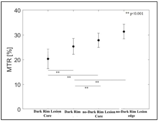 Overall, 40 discrete supratentorial DRLs and 42 comparable no-DRLs were segmented on a 3.0 T scan in the 40 RRMS patients. The following characteristics were obtained at core and rim/edge level of lesions with and without a dark rim: dark rim lesion core (mean MTR (SD), 20.31 (3.96)) and no-dark rim lesion core (27.81 (2.88), p < 0.001); dark rim l (25.30 (3.19) and no-dark rim lesion edge (31.33 (2.96) p < 0.001) (Figure 5).
