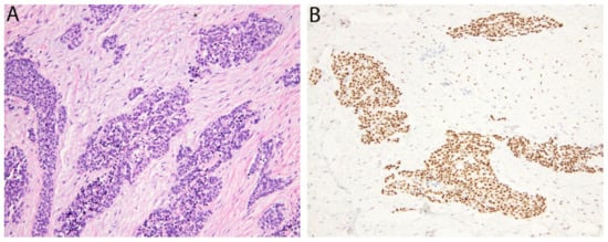 CIC-rearranged sarcoma is an aggressive round cell sarcoma that occurs most often in the trunk and extremities of young adults. Histologically, although it can resemble Ewing sarcoma, the cells typically have more vesicular nuclei with mild pleomorphism and prominent nucleoli, while there is also frequently a lobulated growth pattern and areas of necrosis [100]. Around 95% harbor CIC-DUX4 fusions, with the remainder showing CIC fusion with alternative genes (e.g., NUTM1, FOXO4, and LEUTX) [101]. A common feature among these tumors is upregulation of WT1 and ETV4, which have therefore become useful diagnostic adjuncts; positivity is observed in 95% and 90% of cases, respectively, while 85% express both markers [102]. Diffuse ETV4 expression is more specific than WT1 and the specificity of co-expression is 96% [102]. Of note, since DUX4 represents the partner gene in most cases, immunohistochemistry for DUX4 is a further diagnostic marker which has also been shown to be very reliable in a small series [103].