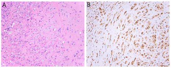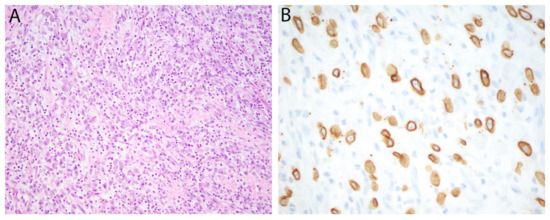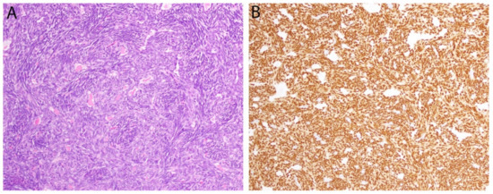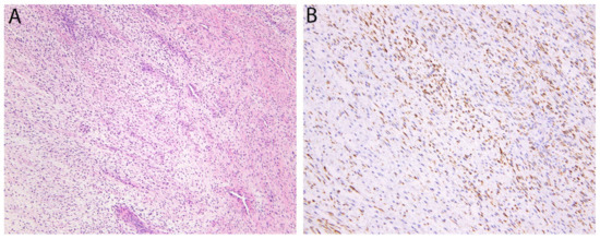 - Yoshida, A.; Tsuta, K.; Ohno, M.; Yoshida, M.; Narita, Y.; Kawai, A.; Asamura, H.; Kushima, R. STAT6 immunohistochemistry is helpful in the diagnosis of solitary fibrous tumors. Am. J. Surg. Pathol. 2014, 38, 552–559. [Google Scholar] [CrossRef]