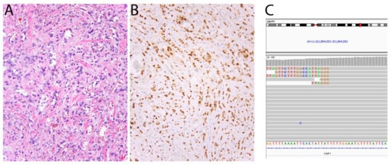 Epithelioid hemangioendothelioma with YAP1-TFE3 fusion. (A) In contrast with conventional EHE, this tumor shows blood vessel formation and cells with abundant eosinophilic cytoplasm. (B) The tumor cells show strong nuclear expression of TFE3. (C) Screenshot of YAP1 in Integrative Genomics Viewer showing several reads mapping to TFE3.