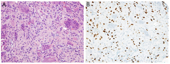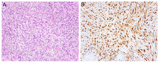 Solitary fibrous tumor (SFT) is a fibroblastic neoplasm of variable biologic potential that can arise at a wide range of anatomic sites. Histologically, it is typically composed of spindled-to-ovoid cells with a haphazard growth pattern and a prominent network of ectatic (‘staghorn’) blood vessels. In 2013, two groups discovered that SFT is genetically defined by a NAB2-STAT6 gene fusion [18,19]. Despite this major advance, the molecular diagnosis of SFT did not become straightforward, since NAB2-STAT6 is generated by a small paracentric inversion of 12q13 that cannot be detected by FISH, while the variable breakpoints also make RT-PCR laborious. Fortunately, soon after the fusion was characterized, several studies established the utility of STAT6 immunohistochemistry as a surrogate marker [20,21,22]. It has become widely adopted as a very sensitive and specific means of supporting the diagnosis. Of note, a small subset of dedifferentiated liposarcomas (DDLPS) may show expression since the STAT6 gene may be co-amplified with its neighboring genes, MDM2 and CDK4 [23].