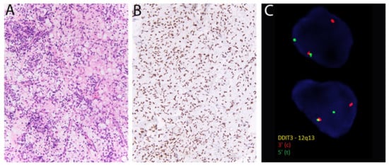 - Scapa, J.V.; Cloutier, J.M.; Raghavan, S.S.; Peters-Schulze, G.; Varma, S.; Charville, G.W. DDIT3 Immunohistochemistry Is a Useful Tool for the Diagnosis of Myxoid Liposarcoma. Am. J. Surg. Pathol. 2020. [Google Scholar] [CrossRef]