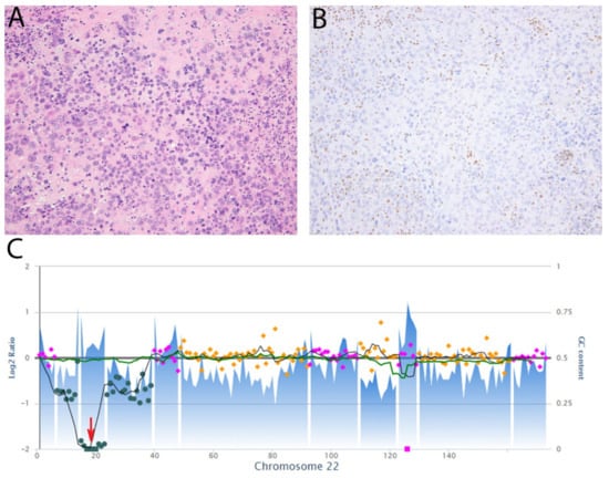 Epithelioid sarcoma, proximal type. (A) The tumor comprises epithelioid cells with large vesicular nuclei and prominent nucleoli. Occasional cells have a rhabdoid appearance due to eosinophilic cytoplasmic inclusions. (B) Immunohistochemistry for SMARCB1 (INI-1) shows loss of expression while there is retained expression in non-neoplastic cells. (C) Copy number plot of chromosome 22 showing two-copy deletion of SMARCB1 (red arrow).